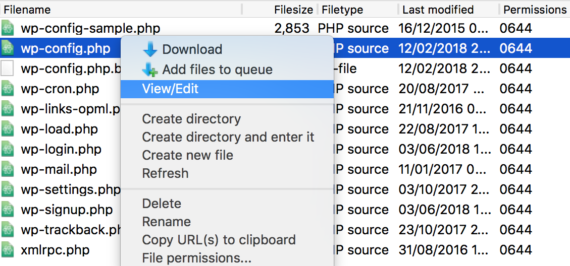 This is one of WordPress’ core files, which dictates how your site works and how it connects to the web. To edit it, right-click on the file and choose View/Edit. This will open it in your text editor of choice: