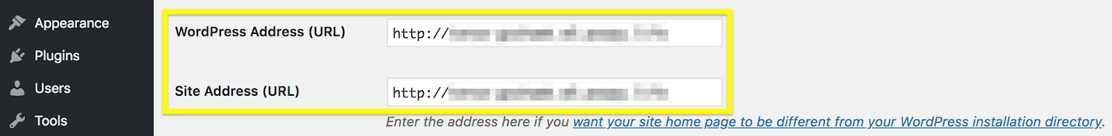This screen contains global settings for your WordPress site. The fields we’re interested in are WordPress Address (URL) and Site Address (URL):