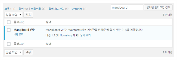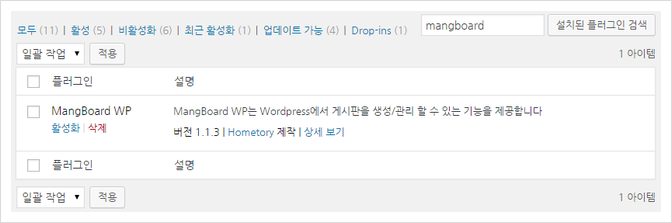 2. 관리자 화면에서 "플러그인>설치된 플러그인" 목록에서 "MangBoard WP" 플러그인을 찾아 활성화 버튼을 클릭합니다