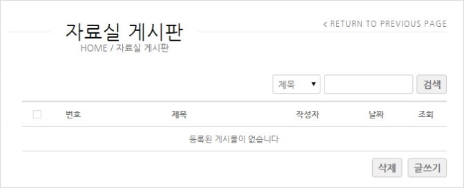 7. 홈페이지에서 추가한 자료실 게시판 메뉴를 클릭하고, 자료실 게시판이 보이면 정상적으로 게시판 추가가 완료되었습니다