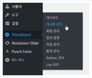1. MangBoard 메뉴에서 게시판 관리 메뉴를 클릭합니다