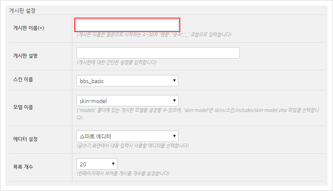 3. 게시판 이름을 board1로 입력하고, 나머지 설정을 입력한 후 확인 버튼을 클릭해 게시판을 추가합니다