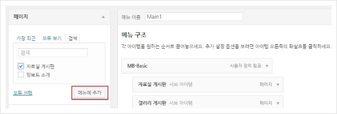 새로 추가한 자료실 게시판을 선택하고 메뉴에 추가 버튼을 클릭해 메인 메뉴에 추가한 다음 메뉴 저장 버튼을 클릭합니다