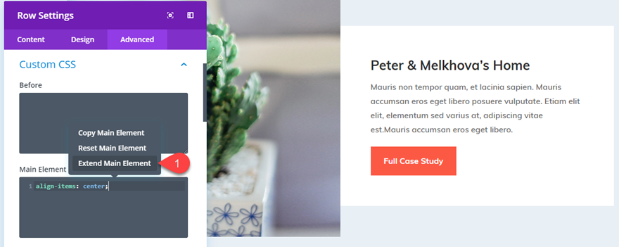 Under the Advanced tab of your Row Settings, we can vertically center the content of our columns by adding the following under Main Element: