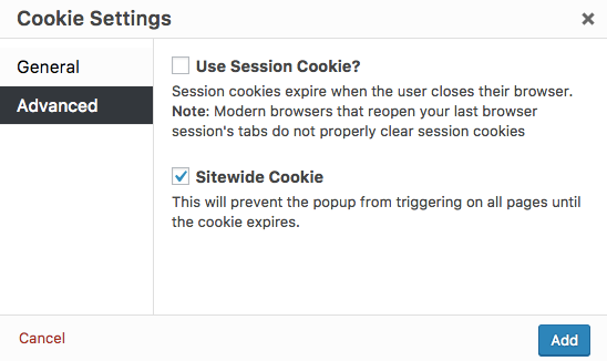 Sitewide Cookie -- By default, this option is turned 'on'. It applies Popup Maker cookies throughout a site, controlling the repeat display of popups on any site page.