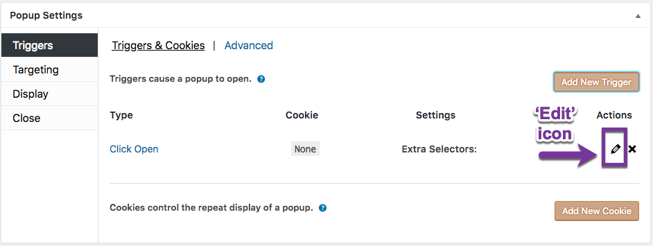 1. To add and link a cookie to a trigger, edit an existing trigger. Select the 'pencil' icon from the 'Popup Settings -- Trigger' option settings tab.