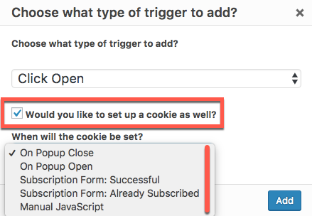 3. Choose from among the five (5) cookie options presented below, then select the 'Add' button to add the trigger and link the cookie. The plugin default selection is set to 'On Popup Close'.