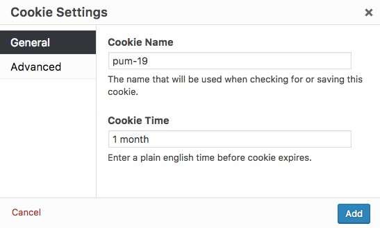 Cookies -- These control the repeated display of popups in the browser. To work, they must be set and linked to a popup trigger. Cookies are assigned an identification (ID) number formatted as 'pum-{integer}'. The use of one or more cookies with a trigger is optional, but often recommended.