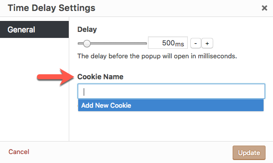 2b. Edit an existing 'Time Delay / Auto Open' trigger -- The 'Time Delay Settings' option settings popup will appear. On the 'General' tab, select the custom field labeled 'Cookie Name'. An 'Add New Cookie' option will appear. Select the option to add it to the custom field, then select the 'Update' button.