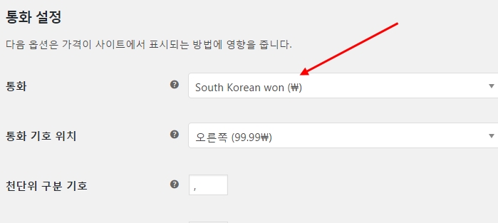 <우커머스 쇼핑몰의 기본 통화 설정>
