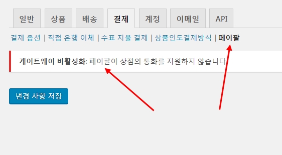 이 경우 우커머스의 결제 방법 중 페이팔은 활성화 되지 않습니다.