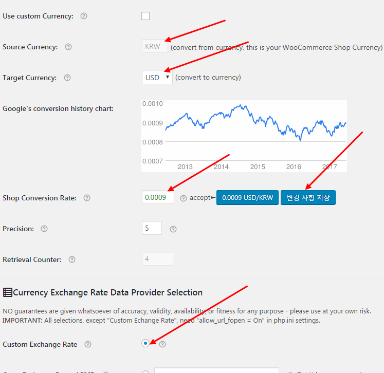 이 글에서 소개 한 것 처럼 원화를 달러로 환산해서 결제 받을 수 있도록 하는데 사용 할 수 있는 방법으로 WooCommerce Currency Switcher 플러그인을 사용 할 수도 있습니다.