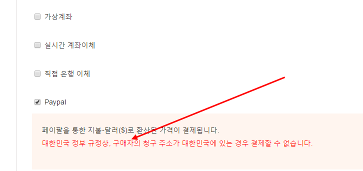 하지만 이 결제 방법은 쇼핑몰의 점주가 페이팔 한국계정을 사용하는 경우, 같은 한국 계정을 가진 사람에게 결제를 받을 수 없습니다. 현재 대한민국에서의 규정이 그렇습니다.(페이팔로 한국인 상호간 거래 불가)