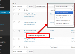 Orders will have a specific currency associated with them. It is the currency that the user was using when placing the order. This will also be reflected on the back-end, where on the Orderspage, each order shows the total in the corresponding currency. On this page, it is also possible to filter the orders by currency.