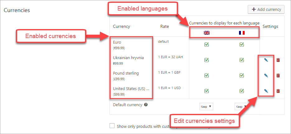 This helps with situations when products in certain languages need to be ordered only in a precise currency. Additionally, default currencies can be set for specific languages so, by default, the users will see product prices in a given currency when they switch to a different language on the front end. The Keep option means that the currency will not change when the language is being changed.