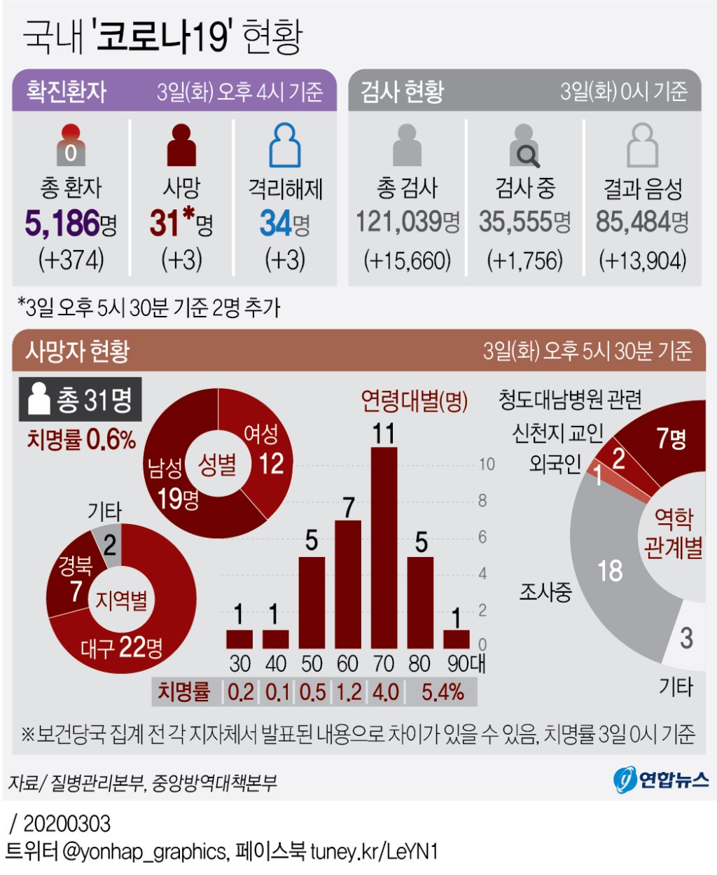 | 국내 '코로나19' 신규 확진자 322명 늘어…총 6088명 (0) | 2020.03.05 |