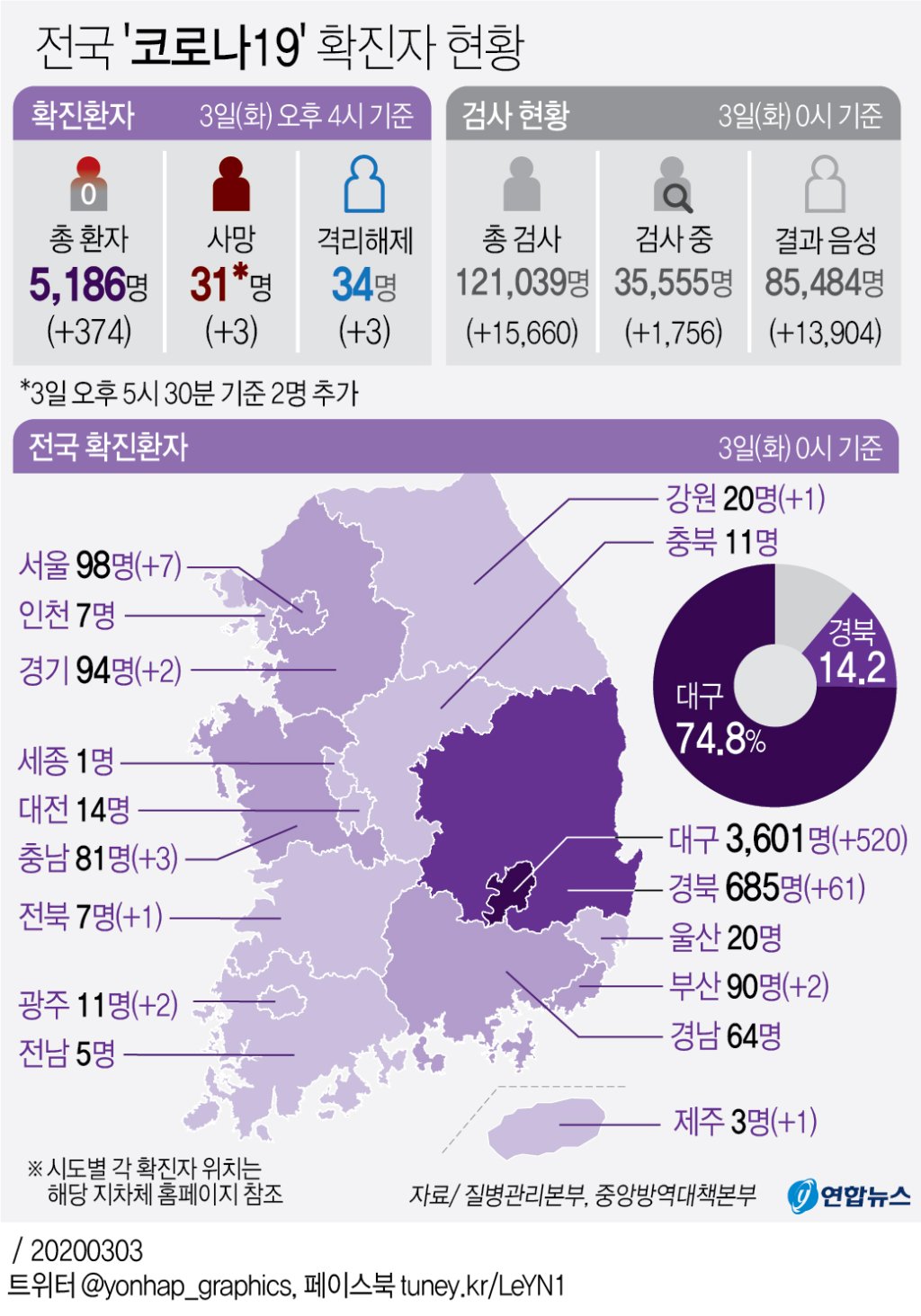 (서울=연합뉴스) 강애란 기자 = 3일 국내 신종코로나바이러스 감염증(코로나19) 확진자가 5천명을 넘어섰다. 1월 20일 국내에서 첫 확진자가 나온 지 43일 만이다.