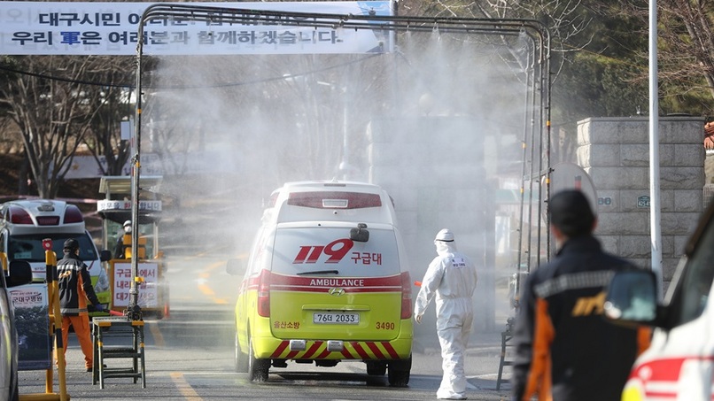 5일 오후 경북 경산시 하양읍 국군대구병원 정문에서 신종 코로나바이러스 감염증(코로나19) 확진자를 태운 119 앰뷸런스들이 줄지어 병원으로 들어가고 있다. / 연합뉴스