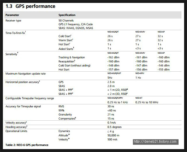 GPS 모듈의 이름은 GY-NEO6MV2 입니다. 메인칩은 UBlox 사의 NEO-6M-0-001 입니다. 기본적인 스펙은 다음과 같습니다.