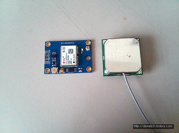 GPS 모듈의 모습입니다. 왼쪽이 GPS 모듈이고 오른쪽은 안테나 입니다.