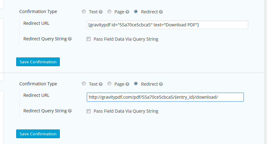 To get it functioning you need to copy the sample shortcode found on the PDF form list and place it on the WordPress page you're sending your user to. Once done, go back to your confirmation configuration and enable the Pass Field Data Via Query String option. Add entry={entry_id} to the field that appears and click save.