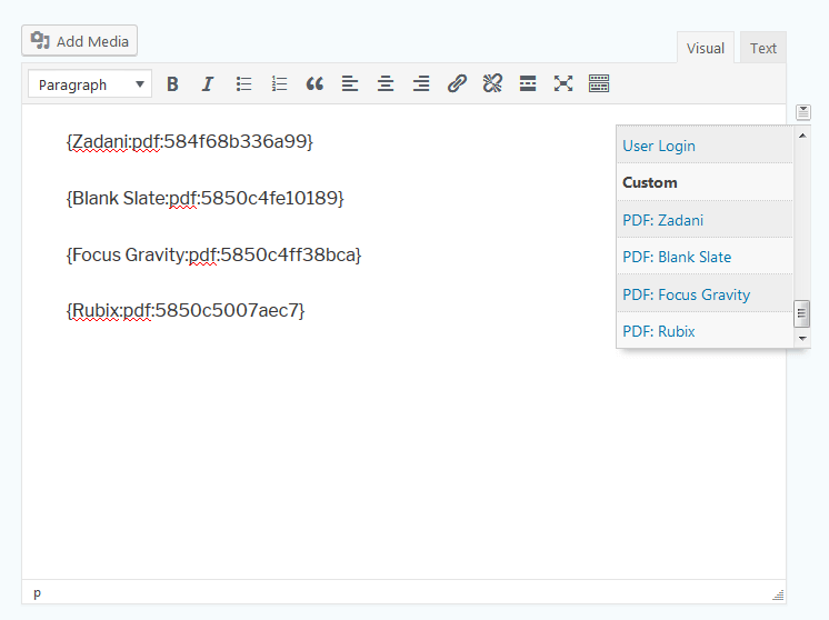 To get it functioning you just need to copy and paste the sample shortcode found on the PDF form list. When you save the confirmation the shortcode will automatically be converted to a direct PDF link.