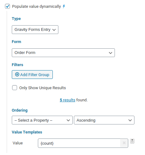 Use the {count} merge tag as a custom Value Template to populate the number of returned results instead of a value. This is useful for conditional logic where you want to show or hide a field based on how many objects exist.
