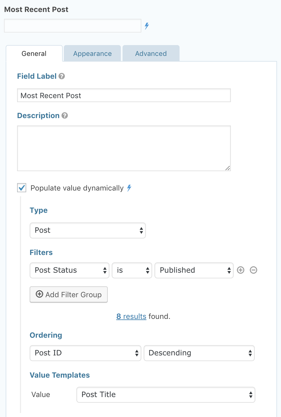 In the example below, we configured a single line text field to have its value populated with the post title of the most recently added post.