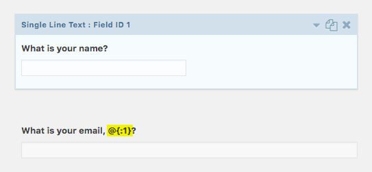 When GF Populate Anything is activated, any merge tag prefixed with an @ will be automatically replaced when its associated field is updated. Live Merge Tags can be used anywhere within your form (labels, descriptions, choices, values, and HTML content).