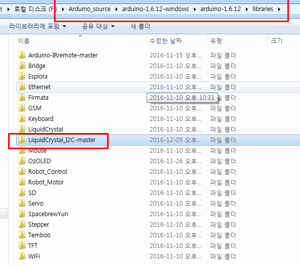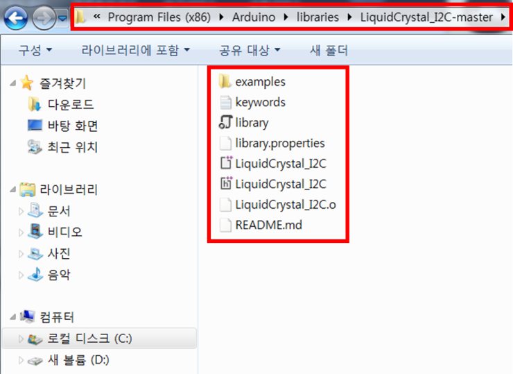 아래 그림과 같이 ' C:\Program Files (x86)\Arduino\libraries\LiquidCrystal_I2C-master ' 경로 안에