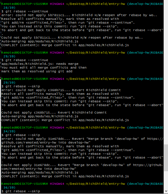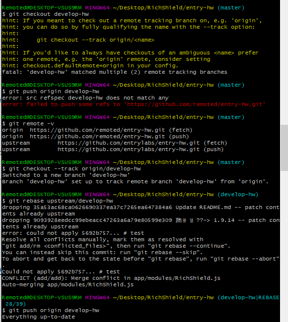 중간 중간에 rebasing 에서 conflict 나는것들은 그냥 skip을 날려버렸다.