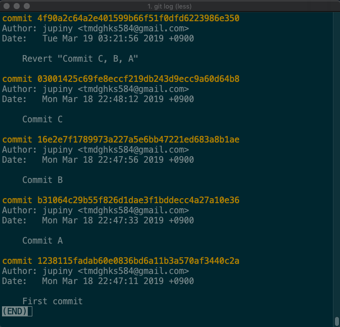 하지만 이 방법도 역시 일일히 revert할 커밋의 수만큼 명령어를 반복해서 실행해야한다는 단점이 있다.