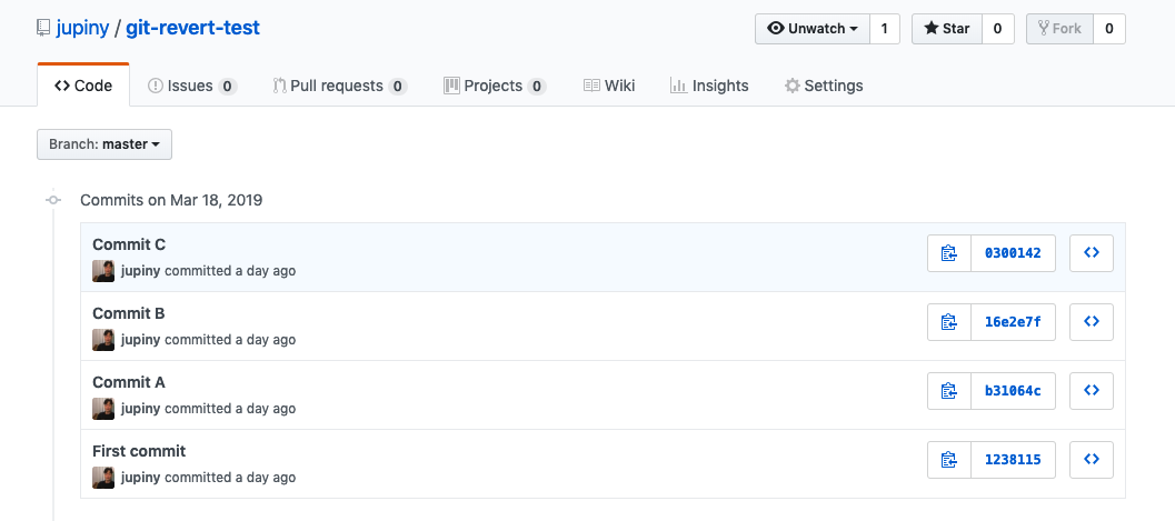 이를 다시 원래대로 돌리기 위해서는 Commit C -> Commit B -> Commit A 순서로 거꾸로 revert하여야 한다(우리가 흔히 사용하는 "실행취소"를 생각하면 이해하기 쉽다.).
