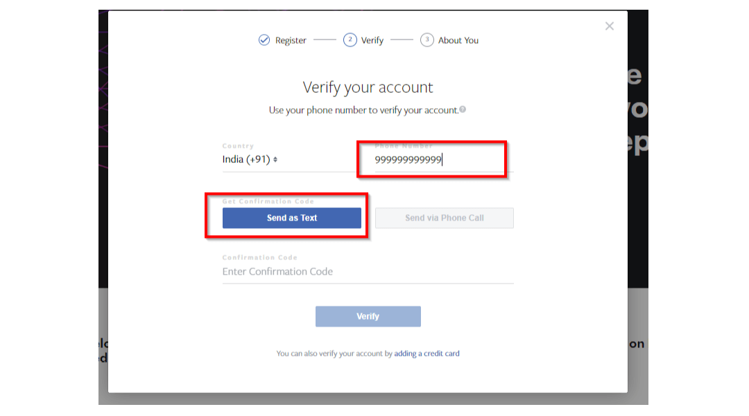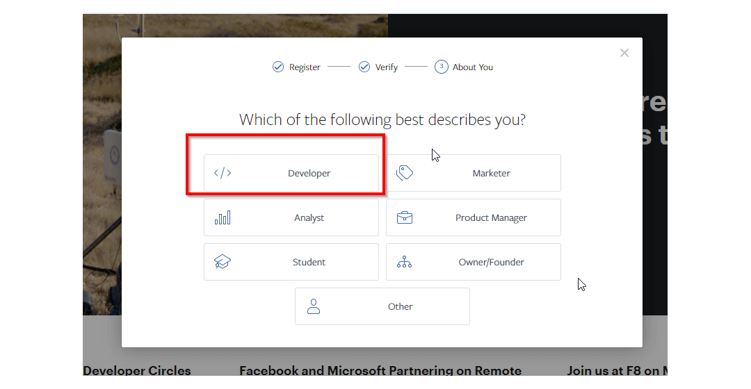 - On the next screen, after verifying your account, 3rd step is to tell about you. Select Developer option here.