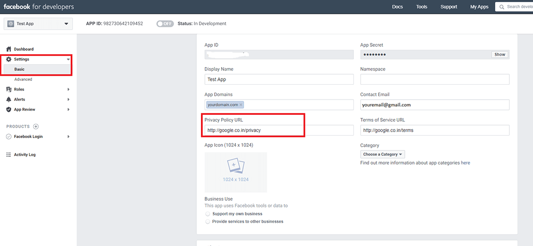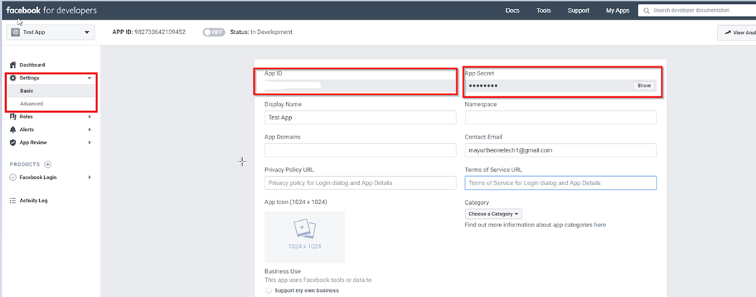 Now expand the Setting menu and select Basic. Here you can find the App ID and App Secret.Then click on the “Show” button in the “App Secret” text box. You can copy the “App Id” and “App Secret” which you can use for your Facebook API calls.