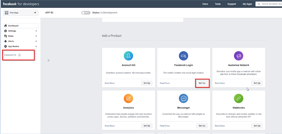 - From the product list page click on “Set Up” button from product with name “Facebook Login”.