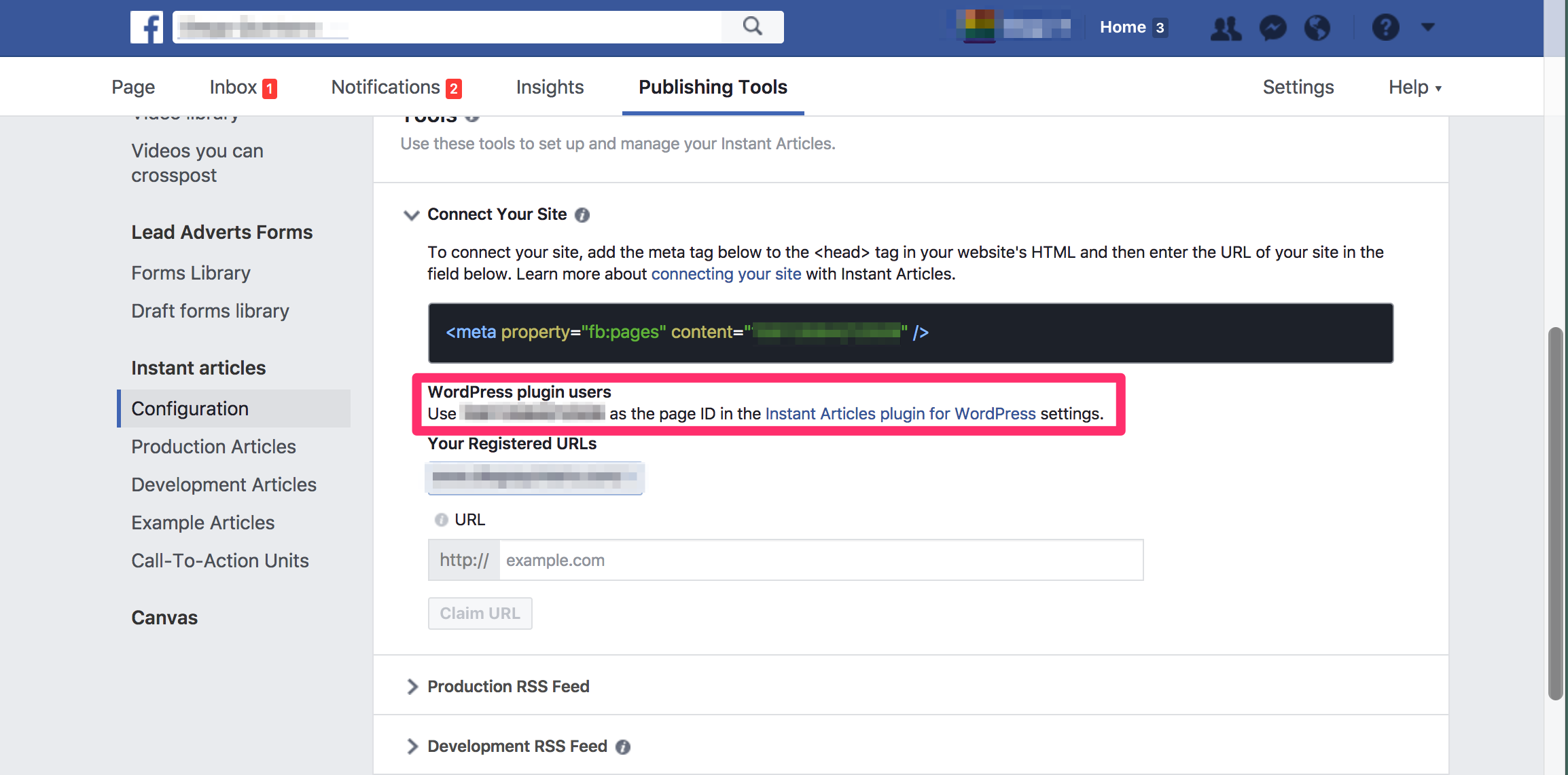 인스턴트 아티클 구성 화면의 "사이트 연결" 섹션에서 페이지 ID를 가져올 수 있습니다.