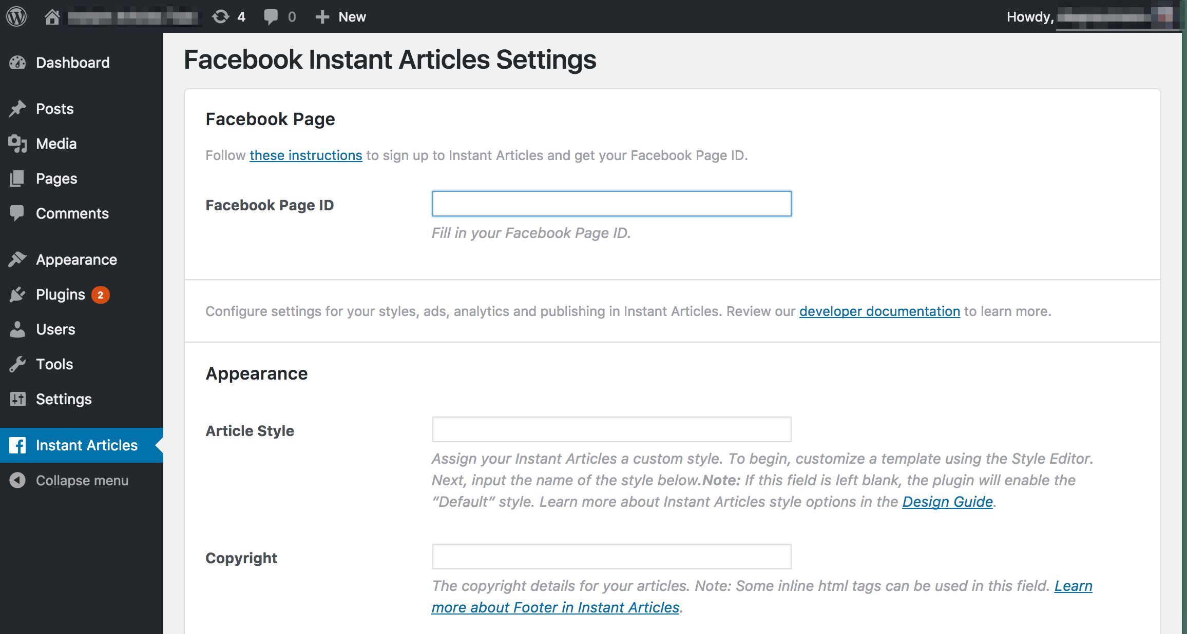 플러그인을 설치한 다음 인스턴트 아티클 메뉴 옵션을 클릭하고 인스턴트 아티클 가입에 사용한 Facebook 페이지의 ID를 입력하세요.