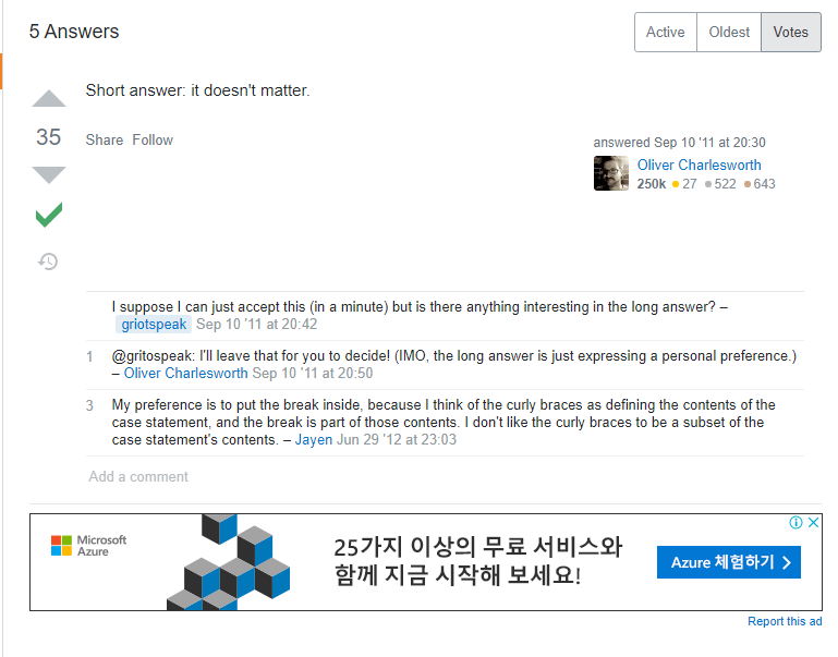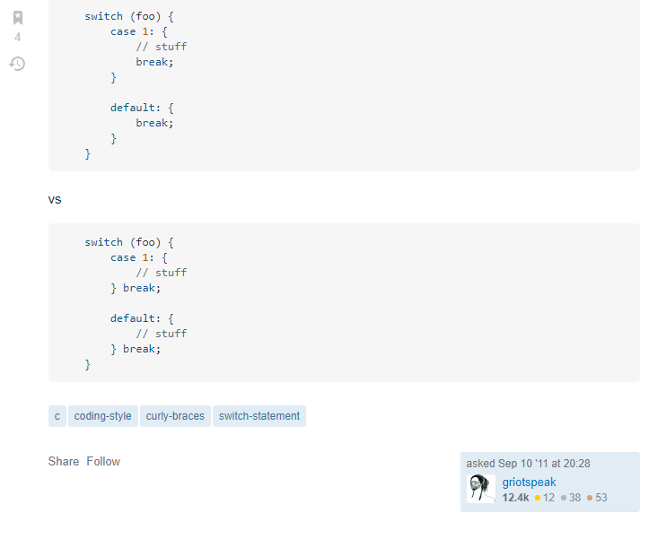 So it really doesn't matter. As for me, I put the break inside the curly braces. Since you can also have breaks in other places inside your curly braces, it's more logical to also have the ending break inside the braces. Kind of like the return statement.