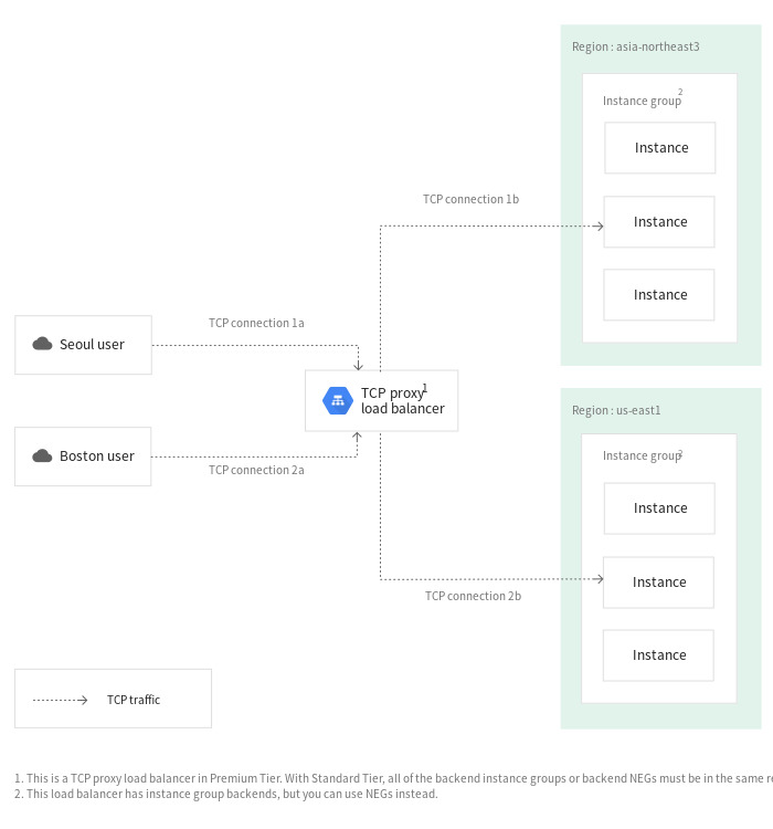 프리미엄 등급에서 TCP 프록시 부하 분산을 전역 부하 분산 서비스로 구성할 수 있습니다. 표준 등급을 사용하면 TCP 프록시 부하 분산기가 리전별 부하 분산을 처리합니다. 자세한 내용은 네트워크 서비스 등급의 부하 분산기 동작을 참조하세요.