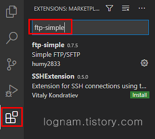 VS Code 프로그램을 실행하여 좌측 하단 아이콘을 누른 후 ftp-simple을 검색하여 설치를 합니다.