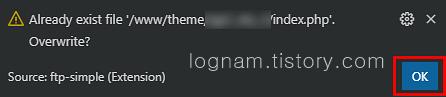 소스를 수정 후 저장을 하면 덮어쓰기 할지 물어봅니다. OK를 누르면 FTP에 업로드가 됩니다.
