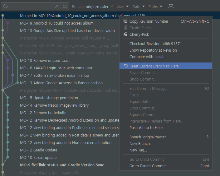 "Reset Current Branch to Here" 을 잡아서 revision 쪽으로 HEAD를 돌리고 나면 commit 이 눈탱이가 돌아갔다고