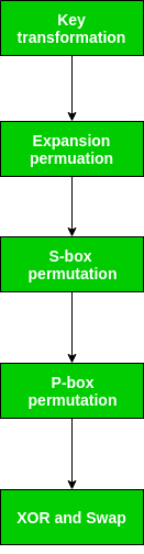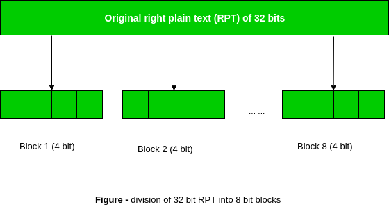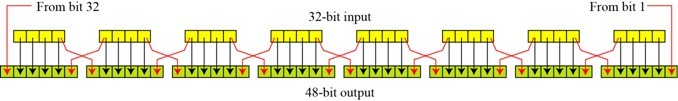 Recall that after the initial permutation, we had two 32-bit plain text areas called Left Plain Text(LPT) and Right Plain Text(RPT). During the expansion permutation, the RPT is expanded from 32 bits to 48 bits. Bits are permuted as well hence called expansion permutation. This happens as the 32-bit RPT is divided into 8 blocks, with each block consisting of 4 bits. Then, each 4-bit block of the previous step is then expanded to a corresponding 6-bit block, i.e., per 4-bit block, 2 more bits are added.