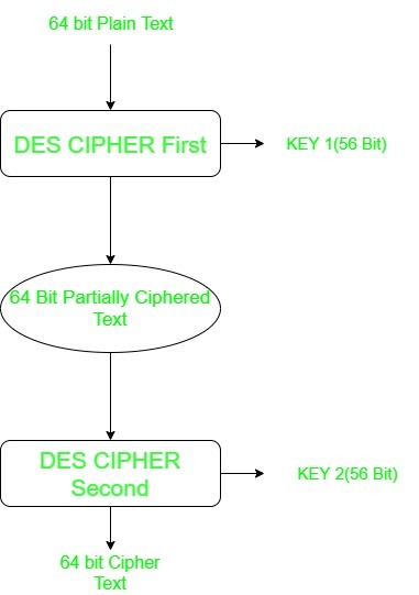 Double DES is a encryption technique which uses two instance of DES on same plain text. In both instances it uses different keys to encrypt the plain text. Both keys are required at the time of decryption. The 64 bit plain text goes into first DES instance which then converted into a 64 bit middle text using the first key and then it goes to second DES instance which gives 64 bit cipher text by using second key.