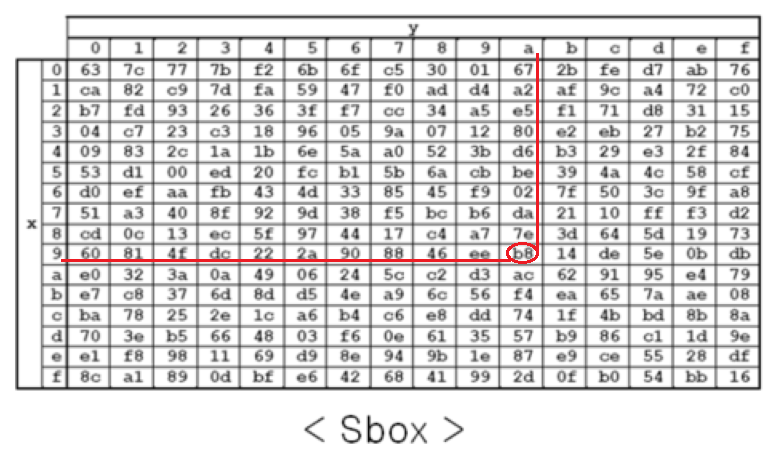 이때 1바이트 값이 9a였다면 S-Box에 의해 b8로 변한다는 것이다.
