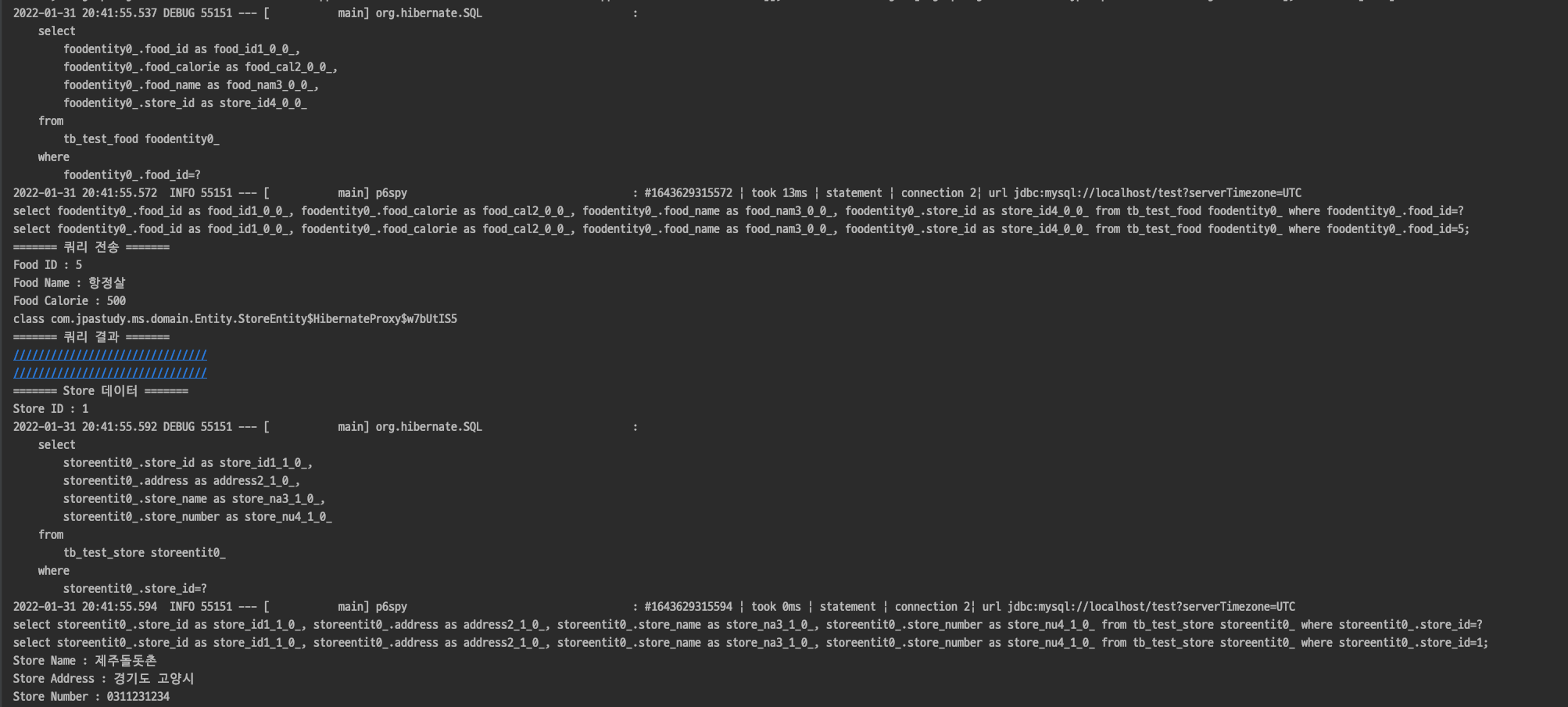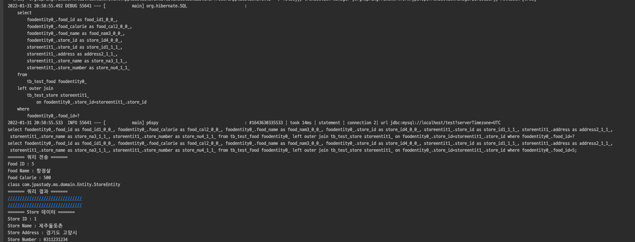 이 경우에는 Food 조회 시 연관관계에 있는 Store 데이터 값들을 프록시가 아닌 실제 객체 값들을 조회하는 쿼리가 나가게 된다.