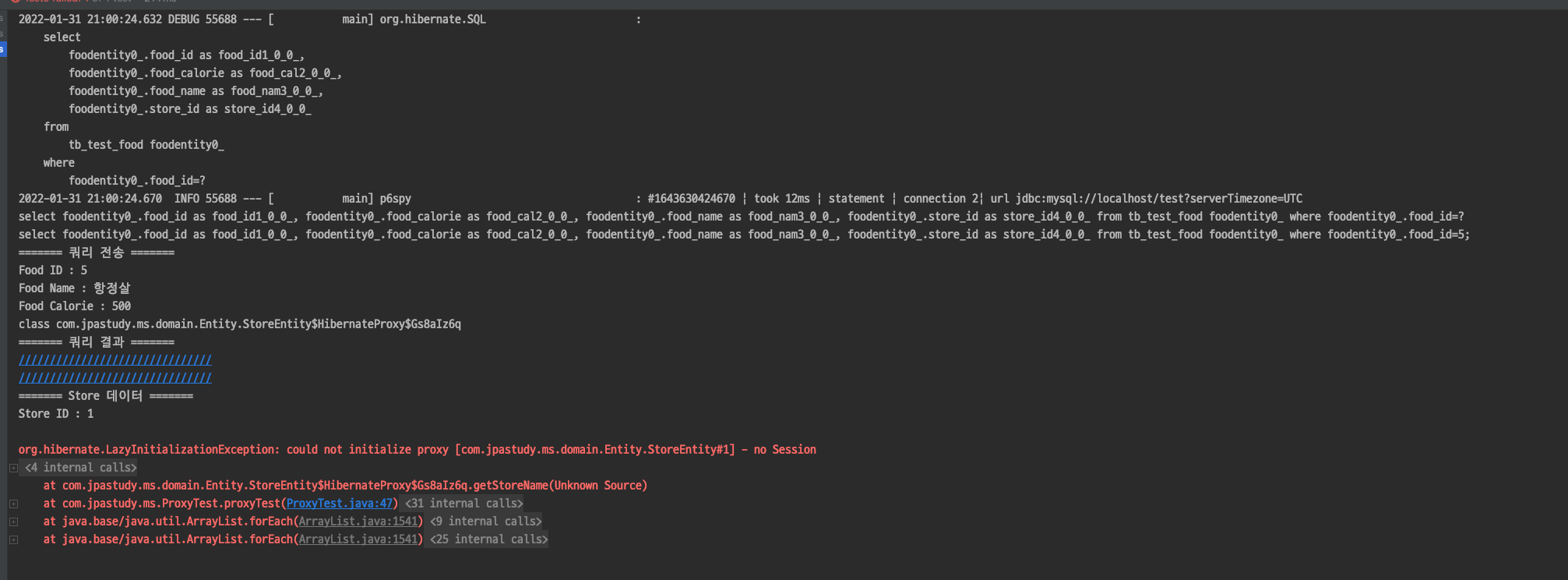 그리고 Food 객체를 Detach, Clear의 메소드를 통해서 준영속성 컨텍스트 상태로 변경 될 경우 해당 프록시 값 초기화 및 호출시 다음과 같은 에러 ( could not initialize proxy - no Session) 가 발생한다.