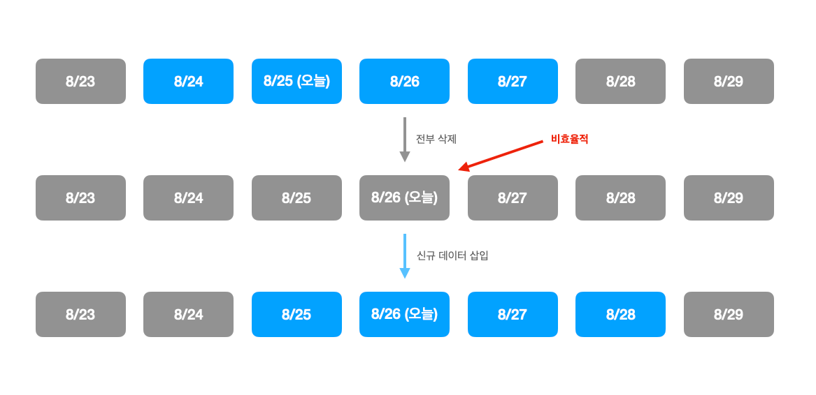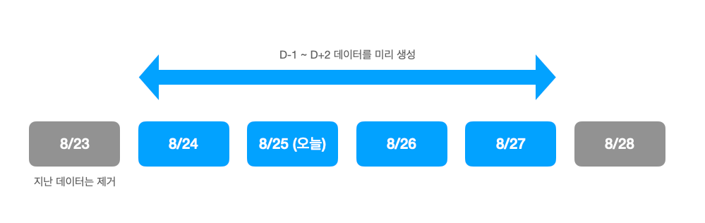 기존 로직에서는 실제 데이터의 변경 여부와는 관계없이 D-1~D+2 데이터를 무조건 재생성하기 때문에,