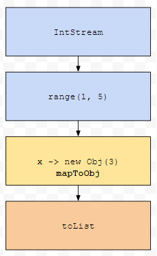 하나의 원소가 새로운 new Obj(3)으로 바뀌는 것입니다. mapToXXX류가 이러한 역할을 수행합니다. 이 경우 IntStream의 원소들을 다른 obj로 변환시키는 apply 작업을 수행했습니다.
